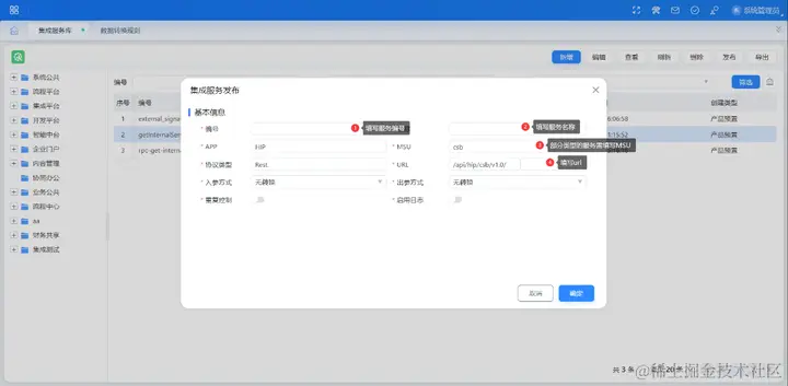 当服务注册并进行管理后,还需要将这些服务发布成 Restful 接口供外部系统调用。点击界面上的发布按钮,只需填写服务编号、名称和 url,即可发布为 OpenAPI 供外部系统调用获取数据。