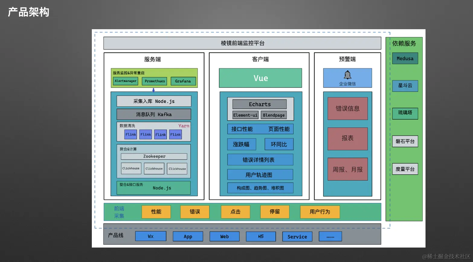 - 采集端:我们在客户端采集各种数据,包括性能数据、错误数据、用户行为等等。