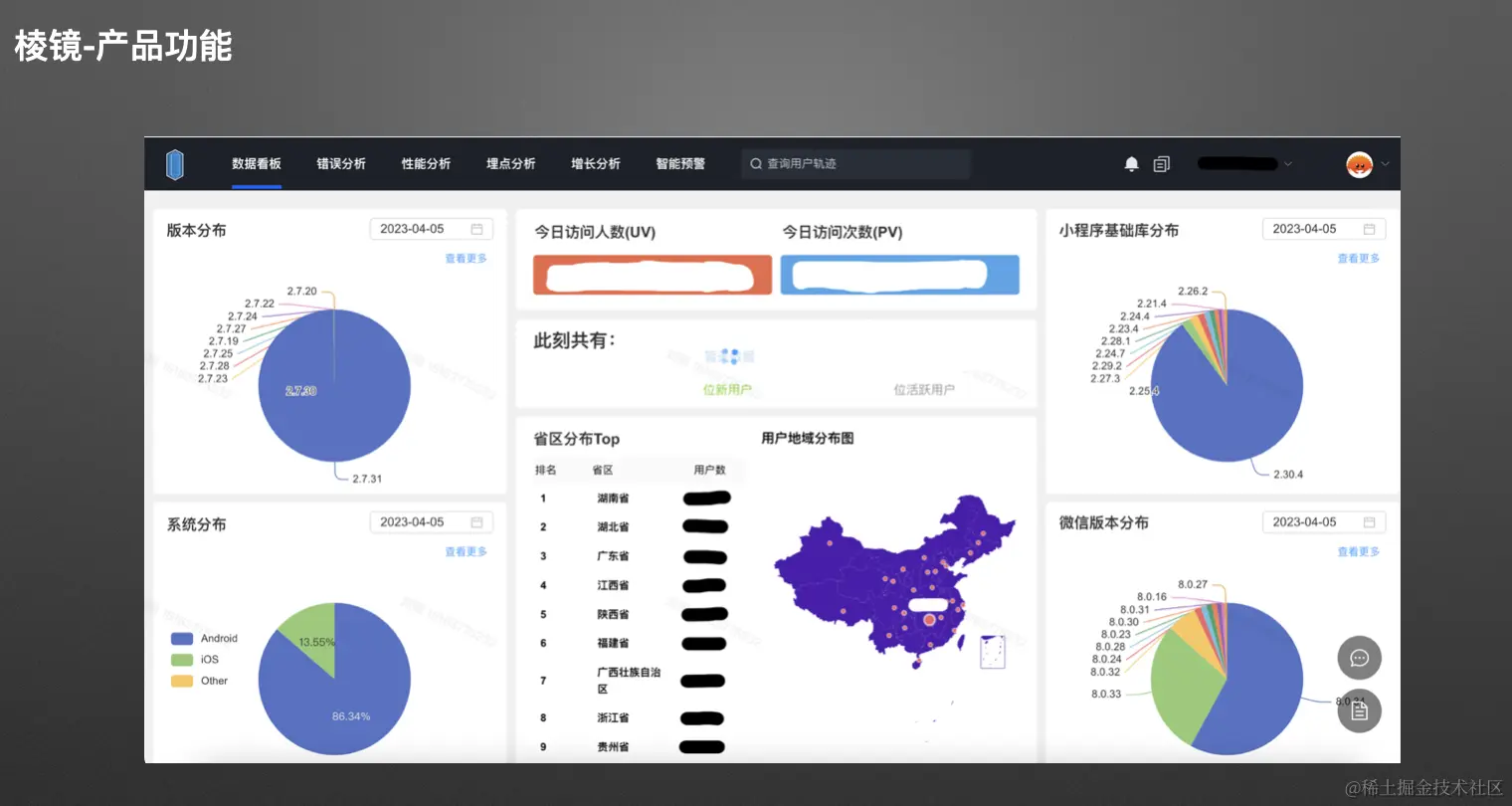 下图是棱镜平台目前提供的工具界面。我们的平台提供了一个全面的应用数据仪表板,包括错误分析、性能分析、埋点分析、增长分析、以及智能预警等功能。通过这个数据仪表板,我们能够有效地查看应用在客户手机上的各个版本的分布情况。特别是,由于我们主要业务是小程序,我们能够获取用户手机上的小程序版本和基础库信息。这些信息有助于我们更好地制定产品决策,减少因系统问题或版本问题而导致的用户体验问题。