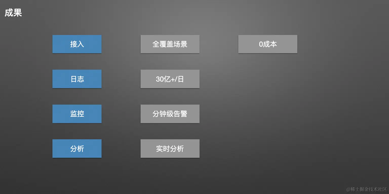 接下来讲一下目前整个产品的成果,就接入方面而言,我们已经成功覆盖了公司的所有产品线,而且实现了零成本的接入。就日志量而言,我们目前平均每天处理超过 30 亿条日志数据。在监控方面,我们已经实现了分钟级的告警,能够及时准确地通知相关负责人。此外,我们的数据是实时分发的,没有任何延迟。这意味着,一旦发生问题,我们会立刻触发告警,通知相关的业务、开发人员、产品团队等,以便迅速做出决策,减少因故障而导致的生产损失。