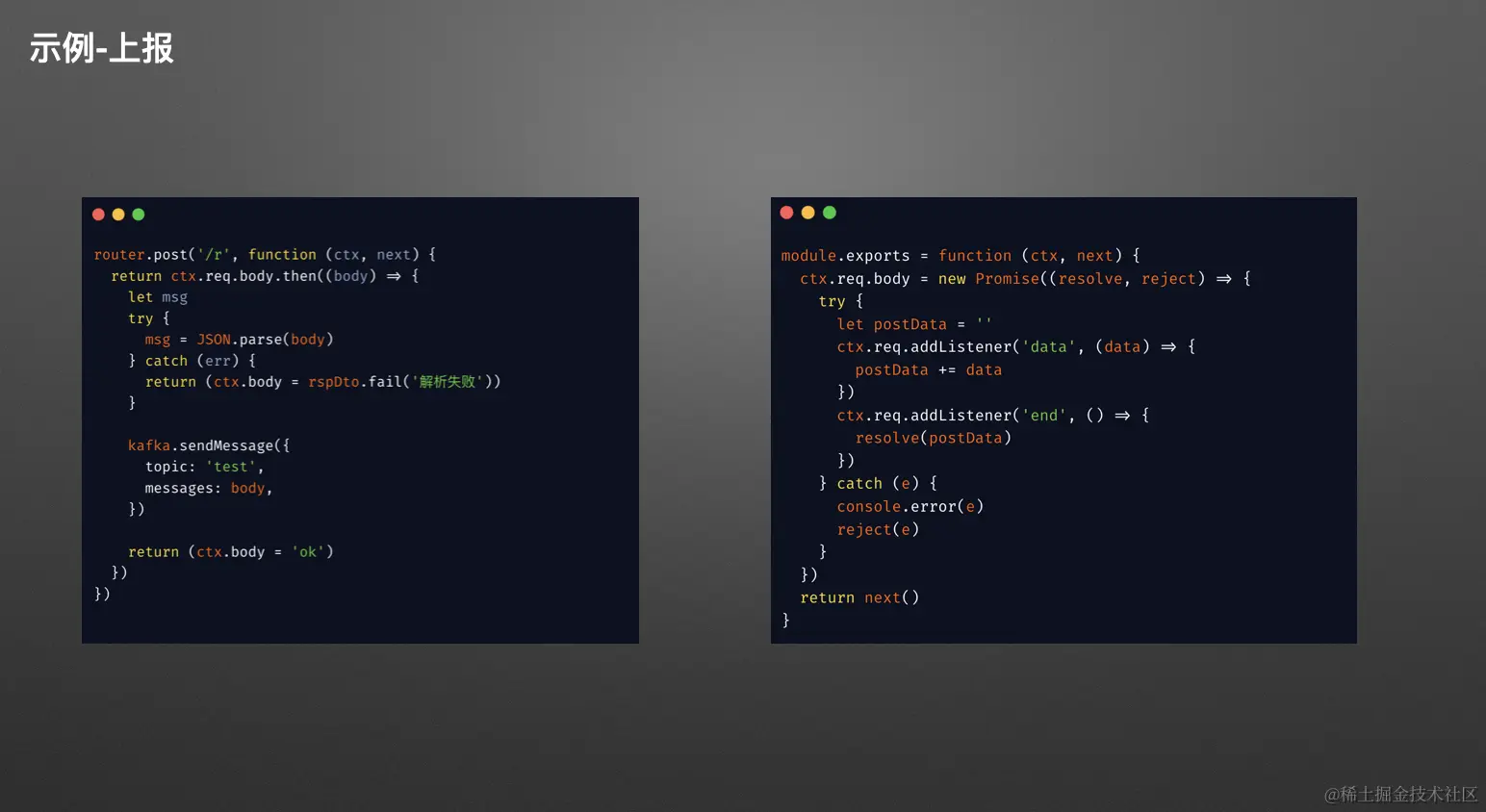 接下来,为大家介绍我们的数据上报接口。实际上,我们的数据上报接口非常简单,我们使用了一个 KOA JS 实现了一个 HTTP 接口。但是,我们没有采用在左图中显示的 KOA 剥离的中间件,因为我们发现,使用 KOA 中间件会导致性能吞吐量很低,延迟特别长,从而导致整个接口的响应速度超过了 200 毫秒。一旦发现了这个问题,我们进行了排查,并查看了 KOA 剥离源码,发现其中实际上包含了许多不适用于我们场景的额外处理。因为我们的场景只需要接收数据并提取数据,所以我们自己查阅了文档,然后在 Node.js 中直接实现了原生的 HTTP 请求体接收方式,用于接收来自用户端的请求数据。接收数据后,我们将其分层处理,JSON 化,然后将其写入 Kafka。