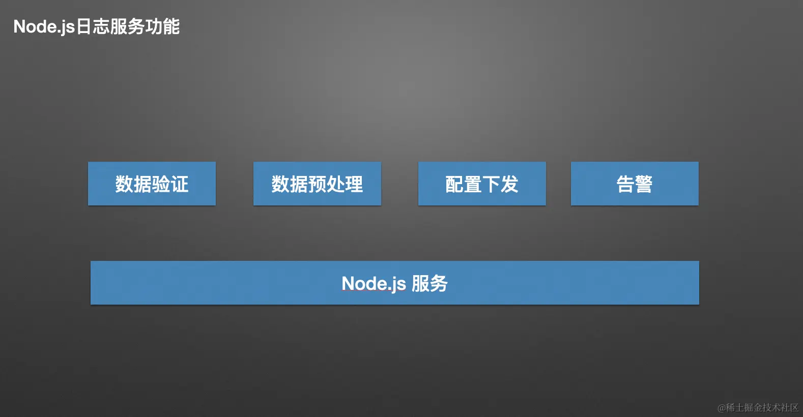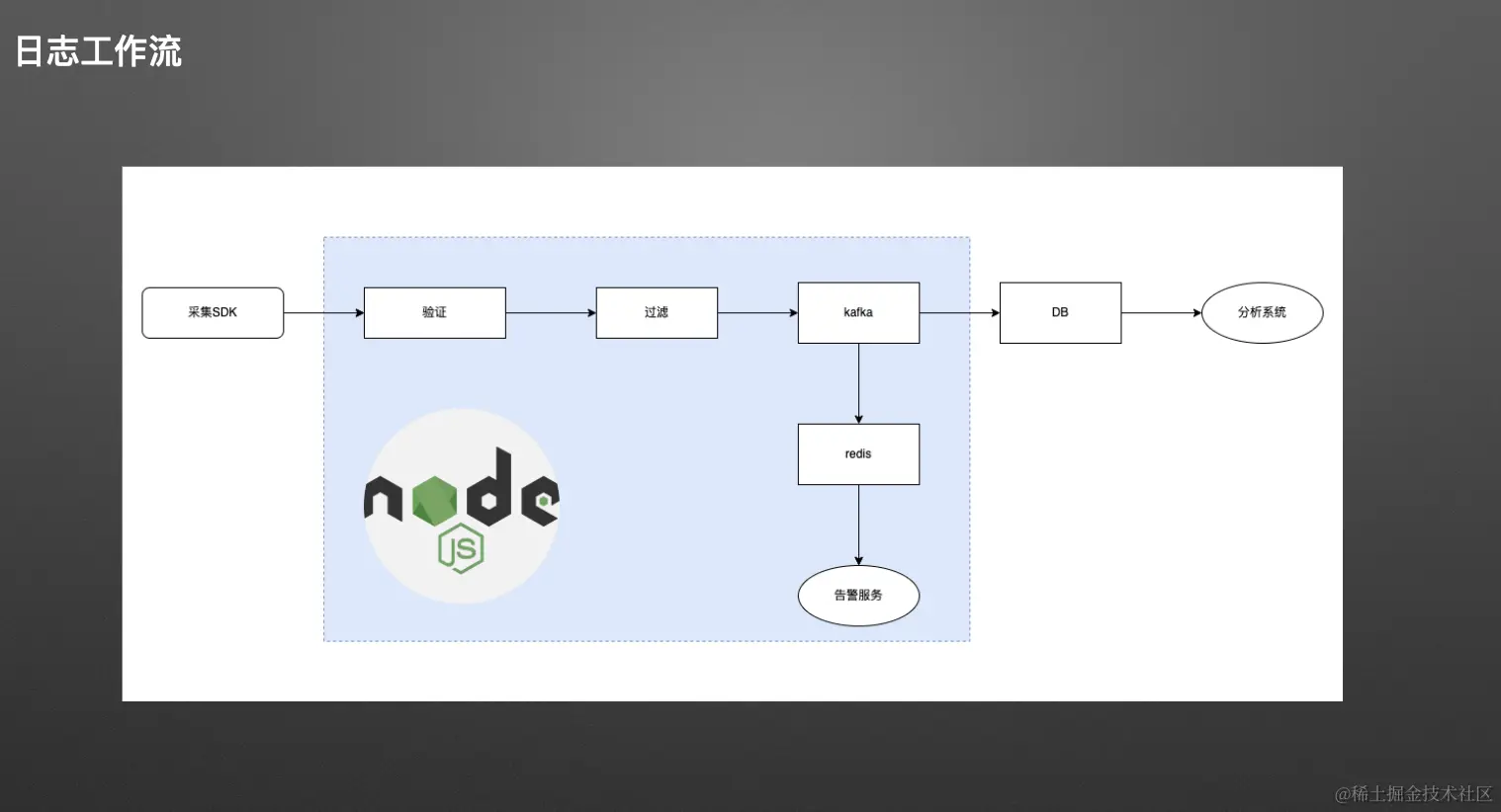 - 不同业务的应用首先接入采集的 SDK。SDK 负责采集各种数据,并将其上报到统一的日志服务,其中日志服务由 Node.js 支撑。