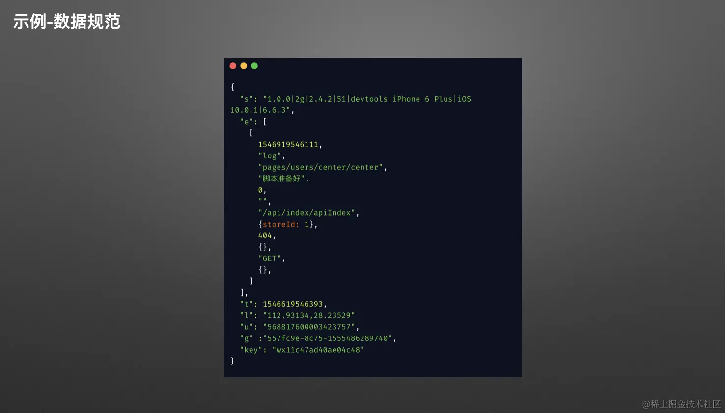 因此,在设计数据规范时,我们需要充分考虑这些因素。如下图所示,这是我们当前平台上错误上报规范的一个示例,我们平衡了数据传输成本和存储成本。在 SDK 端,我们进行了数据的批量聚合处理,而不是每次采集数据就立即上报。这减少了客户端上报请求的次数,并减轻了服务端接收数据请求的压力。