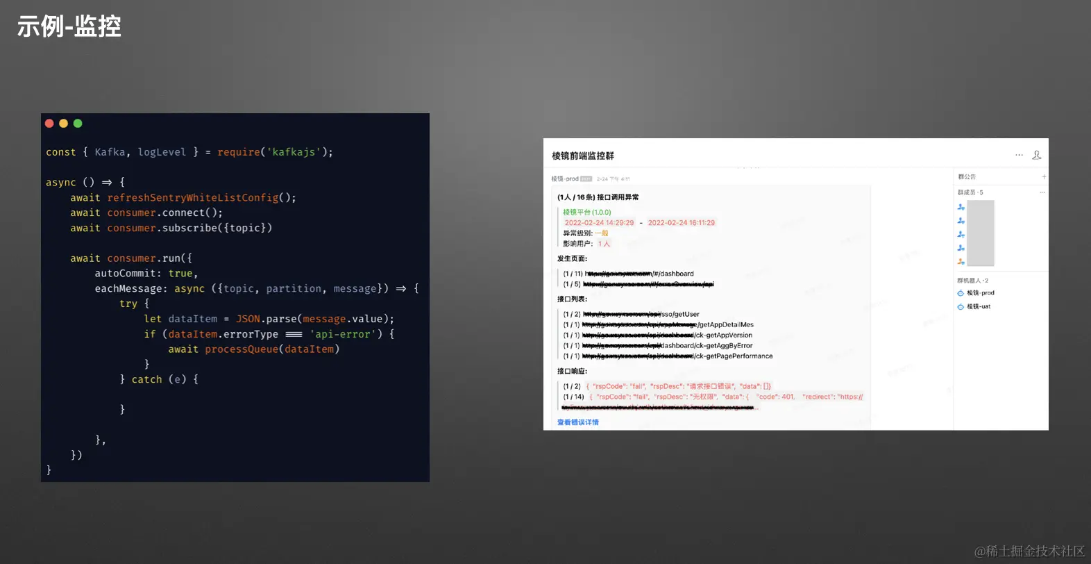 目前,我们的告警是通过企业微信的 Webhook 实现的,但同时我们也在进行短信、电话等其他方式的告警功能的实现。下面左图展示了我们的消费代码,我在这里只简单粘贴了一部分,实际上还有许多业务逻辑需要根据不同的业务进行实时调整。右图显示了我们将 Node.js 日志服务下的告警规则处理后发送的告警信息,其中包括错误的页面、错误的接口、错误的响应以及在某个时间段内受到影响的用户数量等信息。