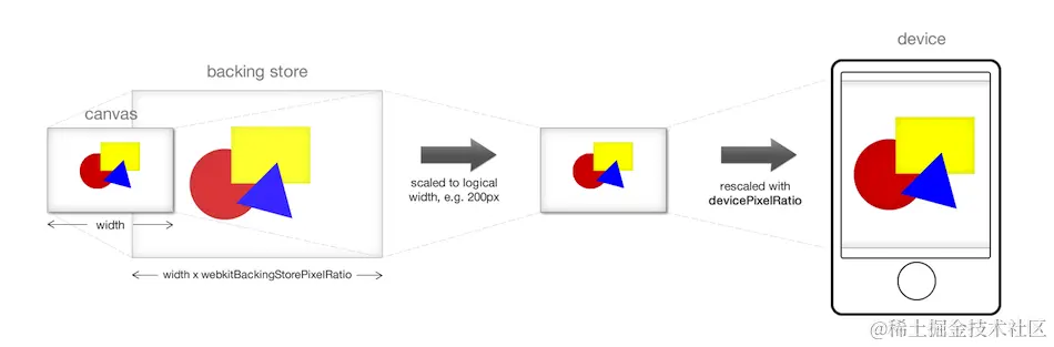 webkitBackingStorePixelRatio表示浏览器在绘制 Canvas 到缓存区时的绘制比例,若图片宽高为200px,webkitBackingStorePixelRatio为 2,那么 Canvas 绘制这个图片到缓存区时,宽高就为400px - 渲染过程:devicePixelRatio
