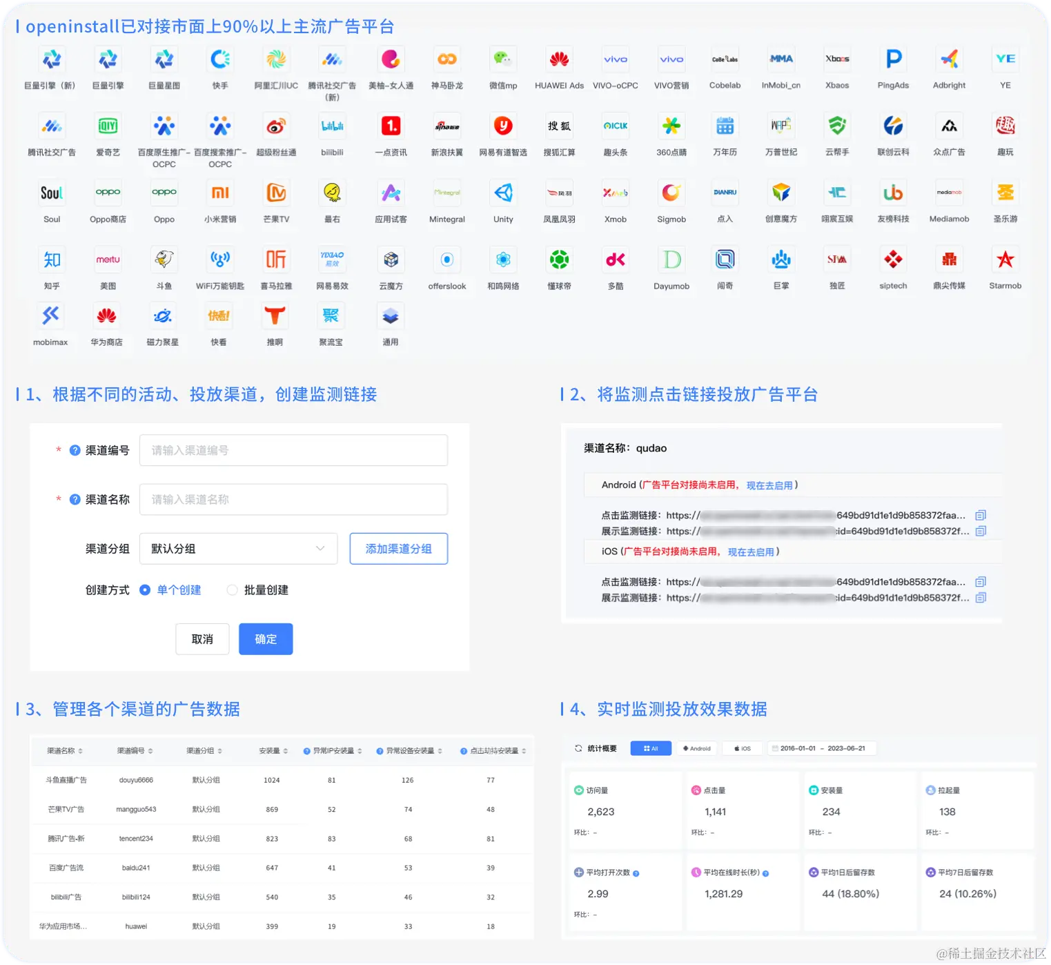 作为第三方广告归因服务商,openinstall的移动广告监测是基于广告归因逻辑实现的,能够从复杂的互联网环境中精准归因广告点击和应用激活来源,提供用户全链路的行为数据归因统计、全局作弊监控、一站式渠道对接、自定义回调事件等全面服务。