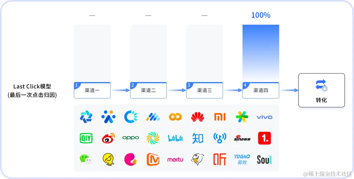 归因逻辑默认采用市场主流的Last Click(最后一次点击归因)原则且不区分渠道优先级,广告主在多个广告平台投放,每次转化会将功劳归因于最后一次点击生效的广告渠道,避免广告主为一次转化给多个媒体付费。解决了当用户跨平台短时间内多次点击同一广告时产生的冲突问题。