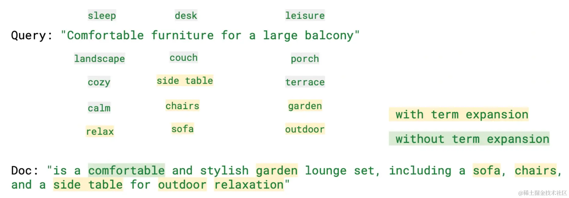 下图突出显示了查询旁边的一些术语,包括带或不带术语扩展的情况。