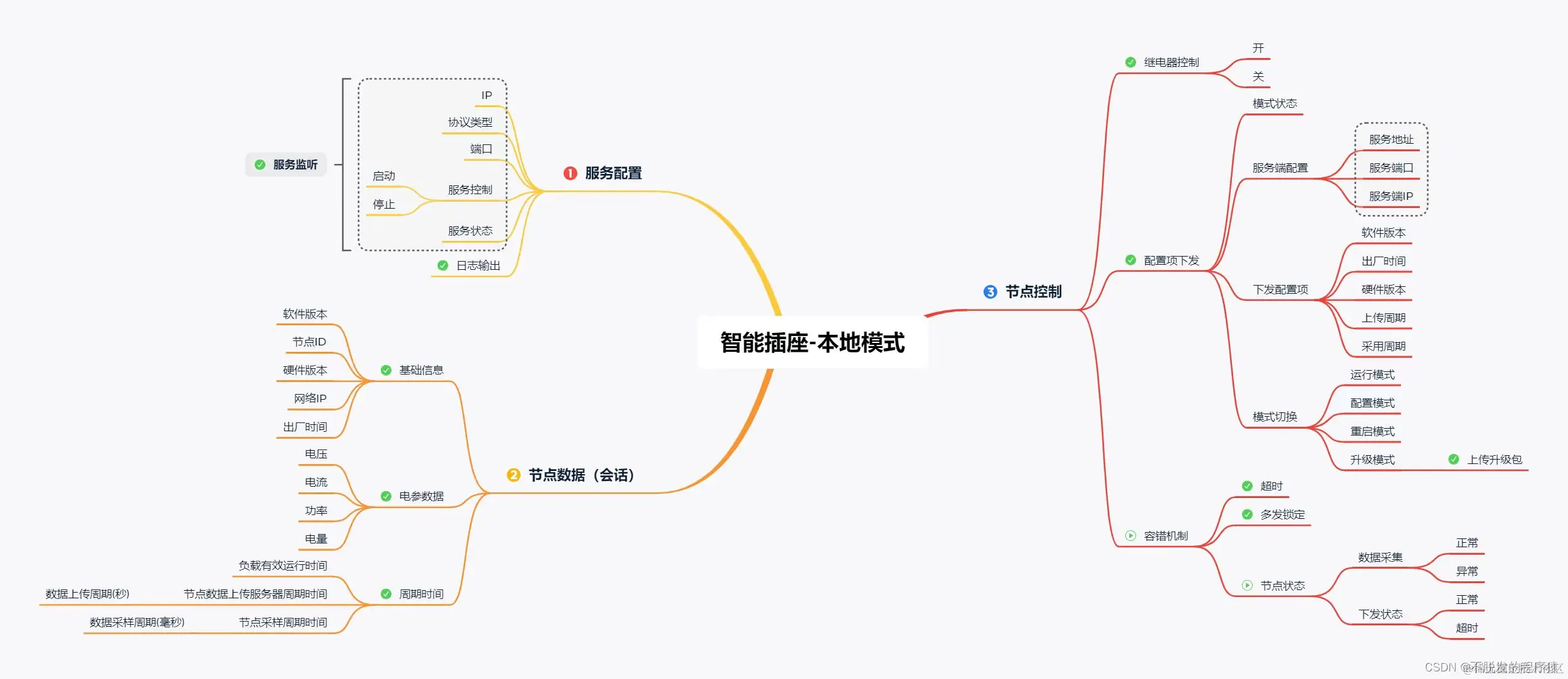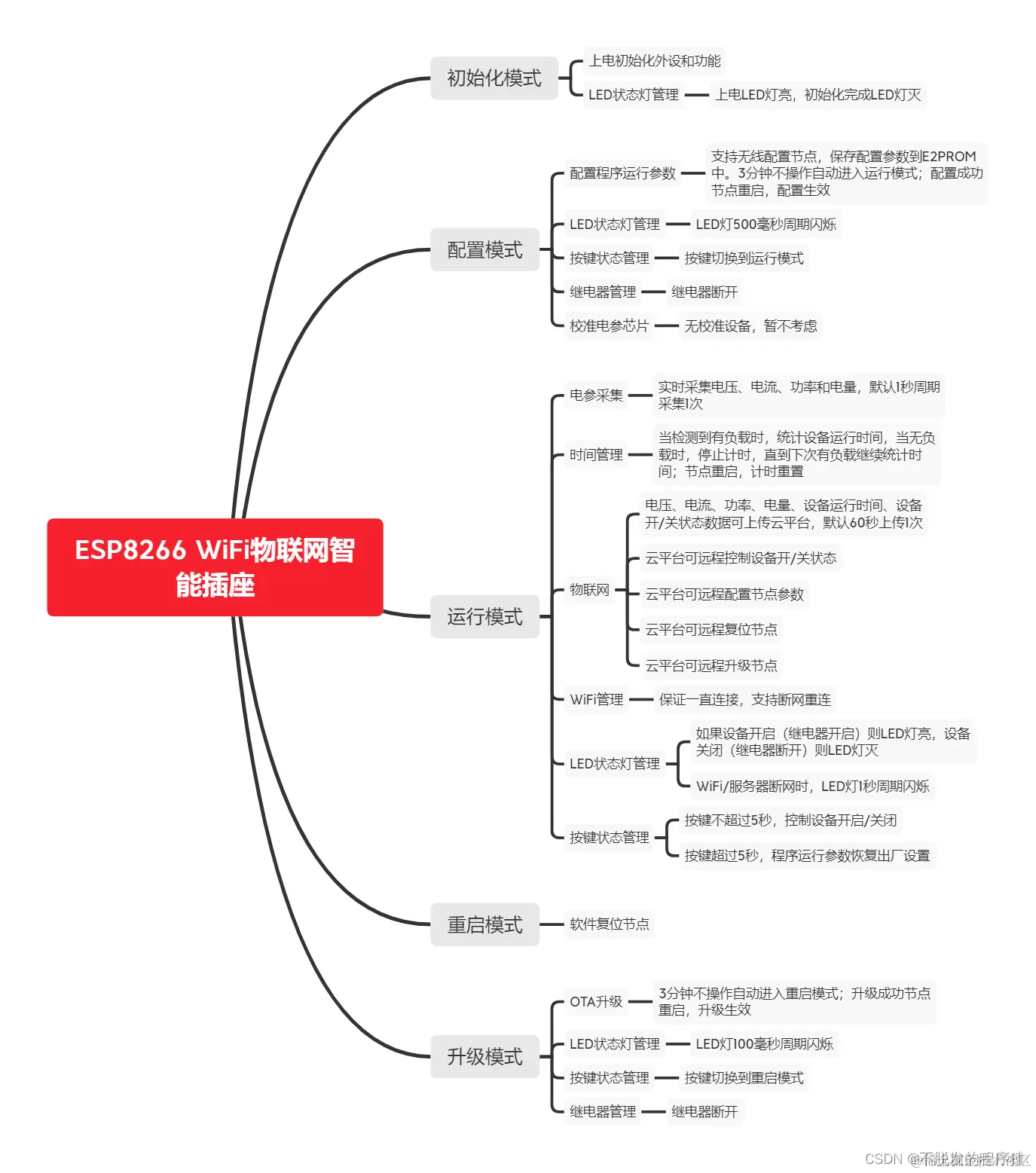 设备节点基于ESP8266国产MCU实现无线配置、电能采集、云端数据传输、开关联动控制和OTA升级等功能,具有5种模式,具体如下图所示:
