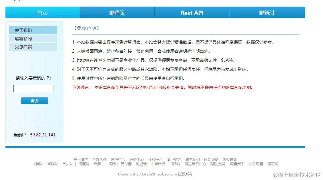 不过淘宝的 IP 地址查询库已经在 2022 年 3 月 31 日下线了,这里我们就不能使用它了,只能另辟蹊径了。