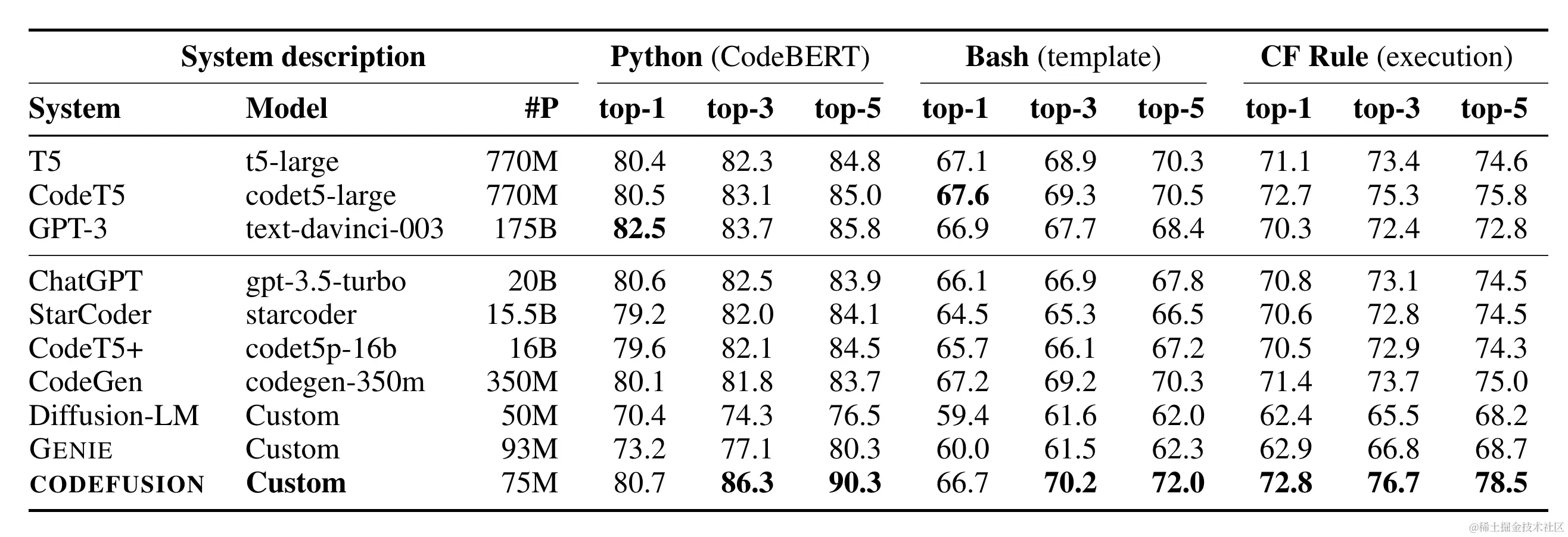 微软在10.26日发表了一篇论文CODEFUSION: A Pre-trained Diffusion Model for Code Generation,主要内容是提出了一个叫做CodeFusion的模型,它是一个基于扩散模型的从自然语言到代码生成模型,相对于论文提到的这个模型,更劲爆的是论文中的一张表格: