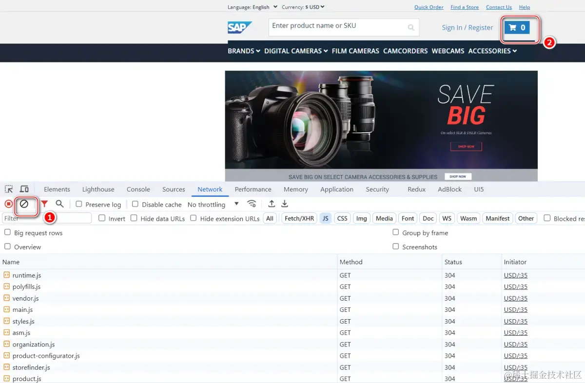 我们首先点击 Clear 图标清除已经捕捉的 Network 请求,然后点击购物车图标,进入购物车页面:
