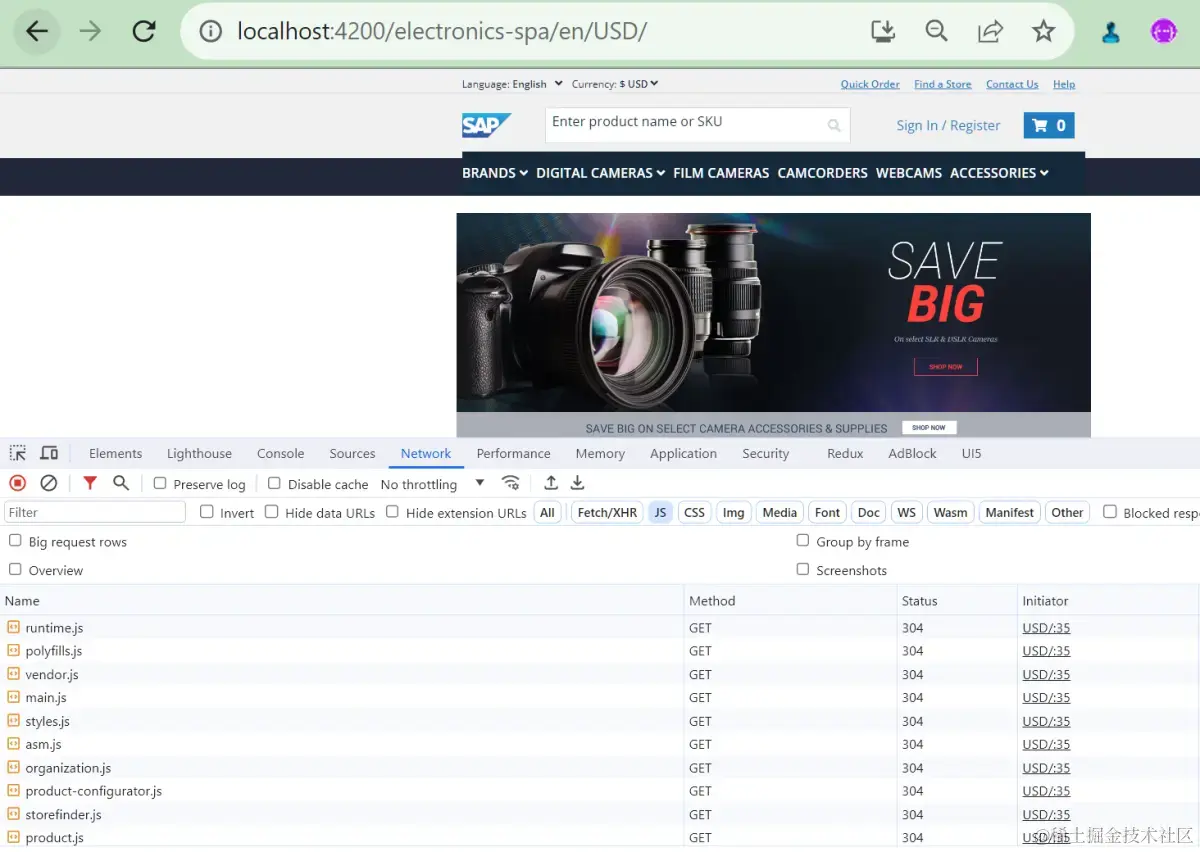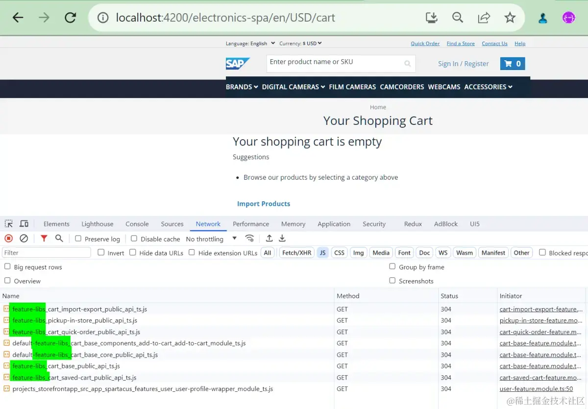我们首先在浏览器里打开 Spartacus 首页,在 Chrome 开发者工具 Network 面板观察首页渲染时,需要加载的 JavaScript 资源文件: