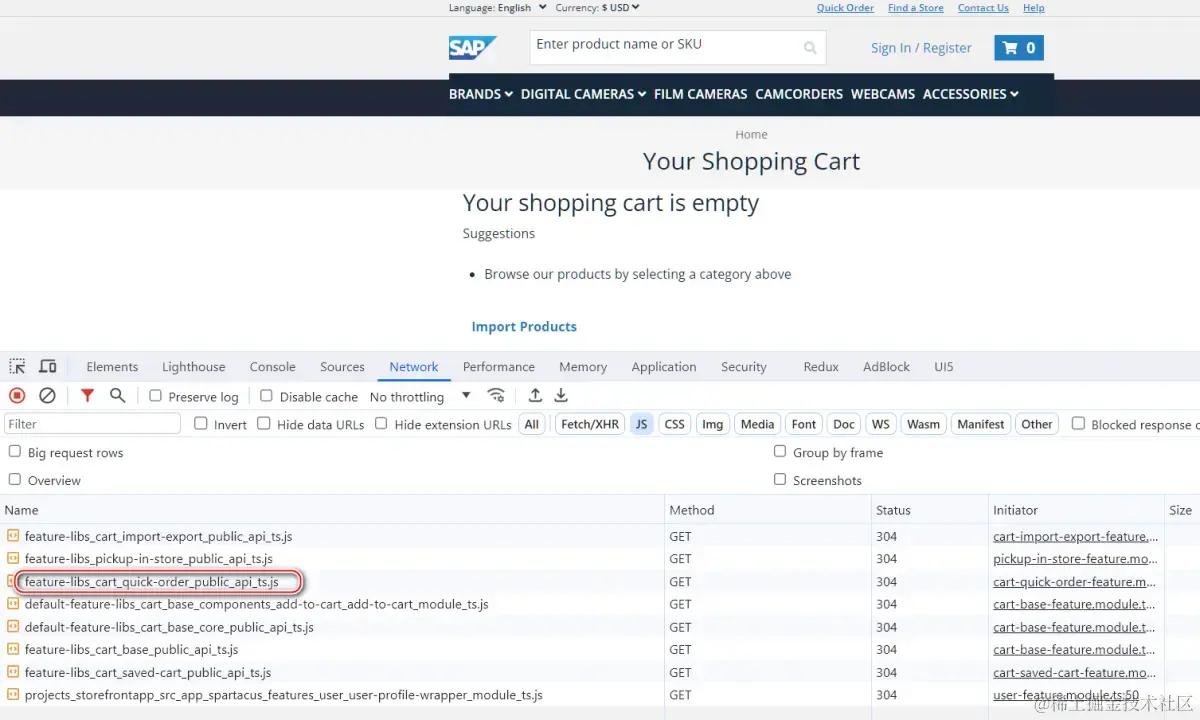 我们从图3 Network 面板里随便挑选一个被 Lazy Load 加载的 JavaScript 文件,比如 feature-libs_cart_quick-order_public_api_ts.js:
