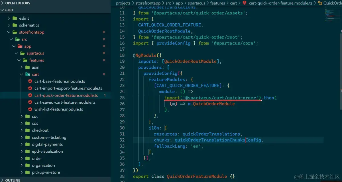 其中的核心逻辑和奥妙,就在于第 25 行代码的 import('@spartacus/cart/quick-order').