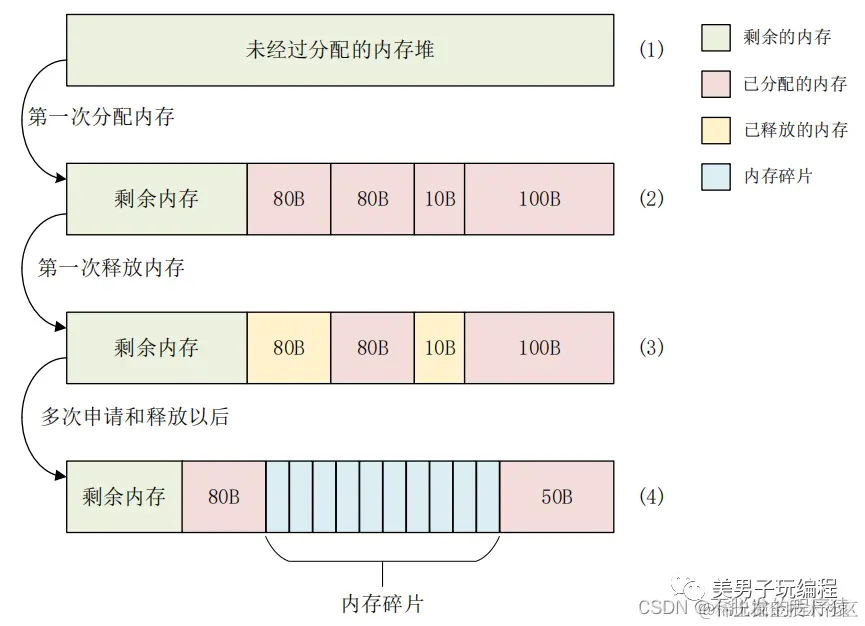 内存碎片产生过程,如下图所示: