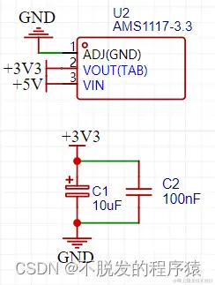 5V转3.3V电源选用常用的AMS1117 LDO电源芯片,原理图设计如下图所示: