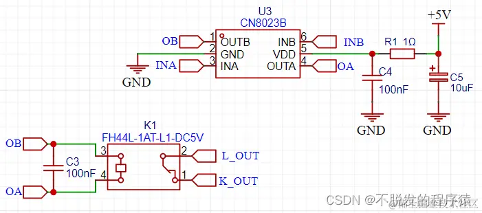 磁保持继电器模块需要使用方波脉冲信号驱动,所以要采用专用驱动芯片,原理图设计如下图所示: