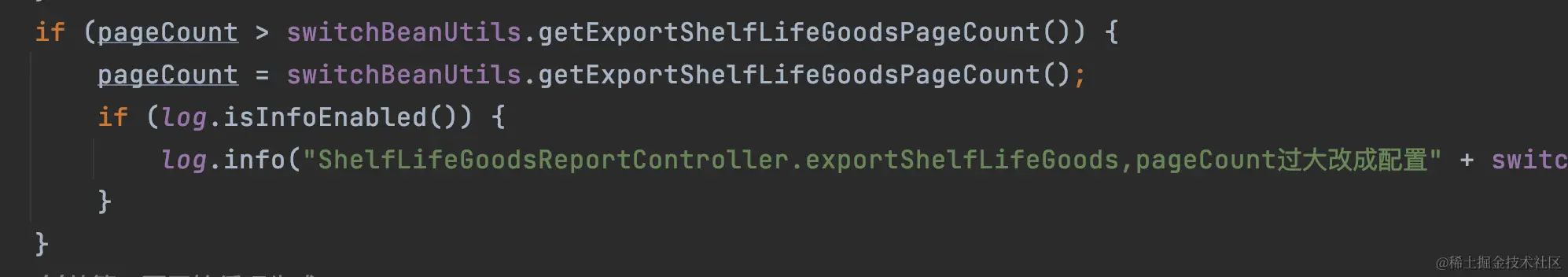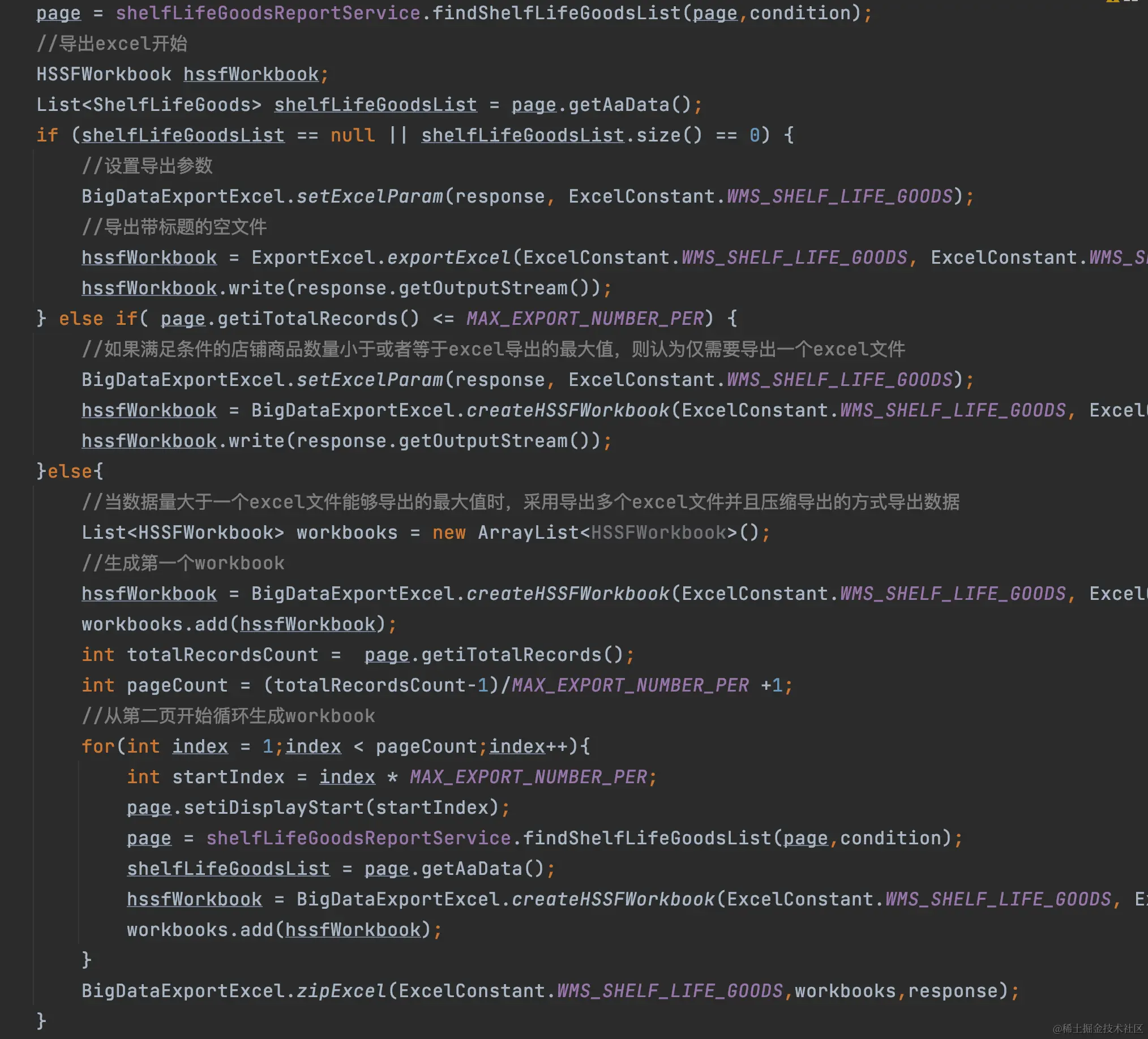 通过查看问题对应的代码类方法,发现该方法功能是"导出WMS保质期商品数据",该方法会调用库存分页接口查询保质期商品,大致如下: