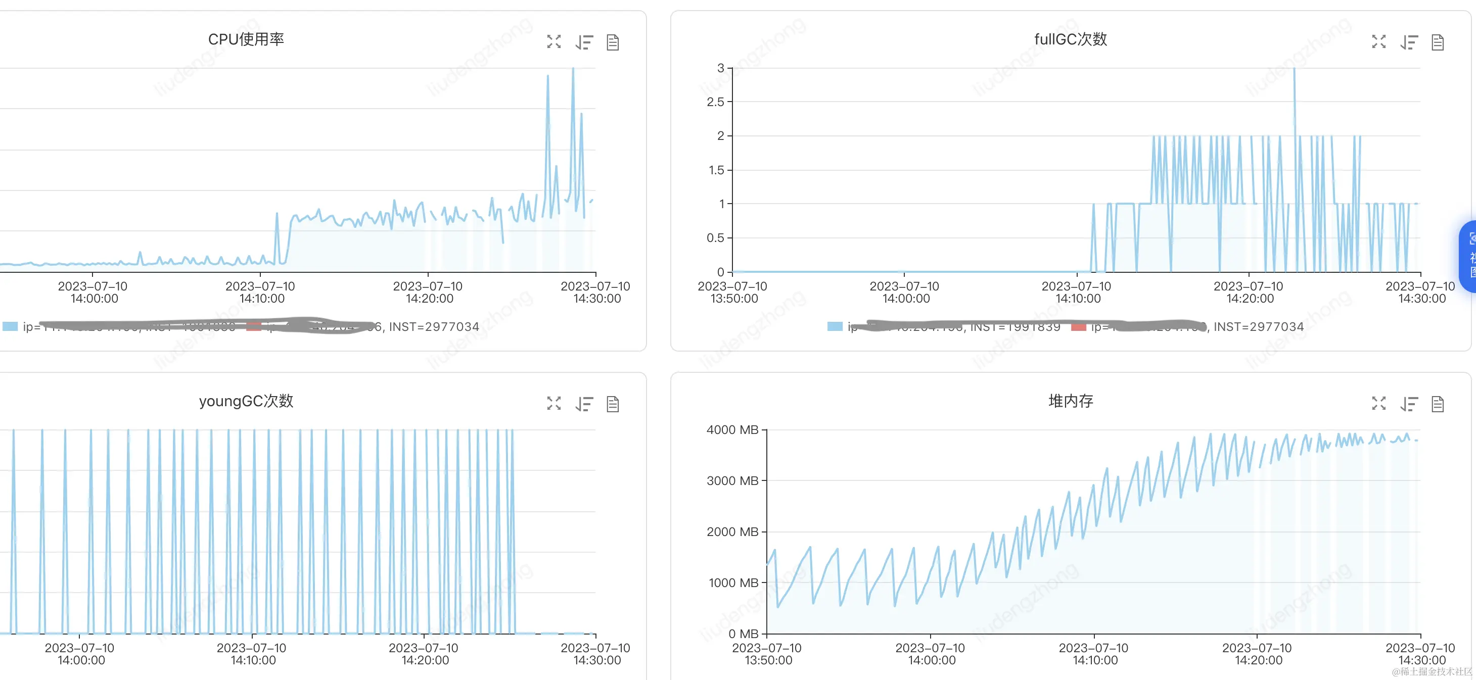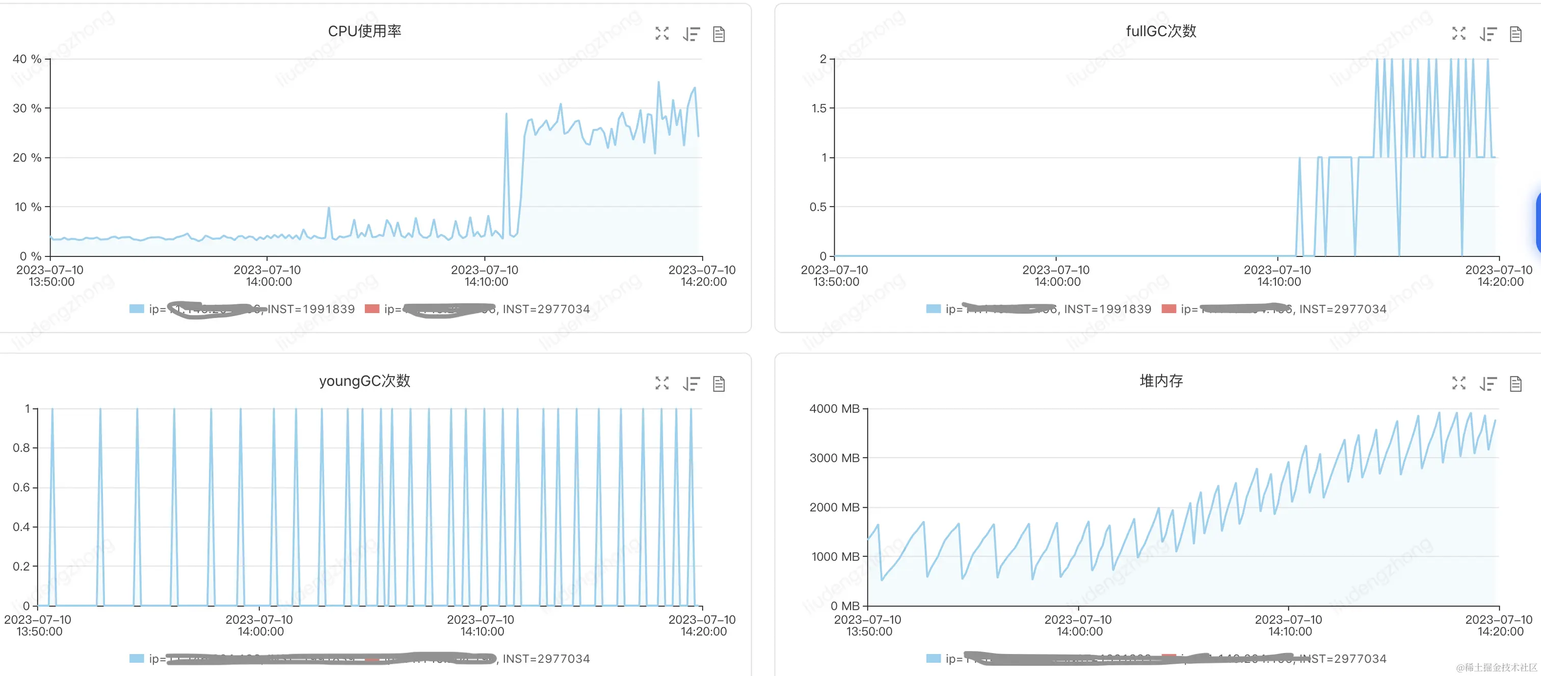 通过查看PFinder发现内存一直在增长,没有停止迹象,触发fullGC也并没有下降趋势: