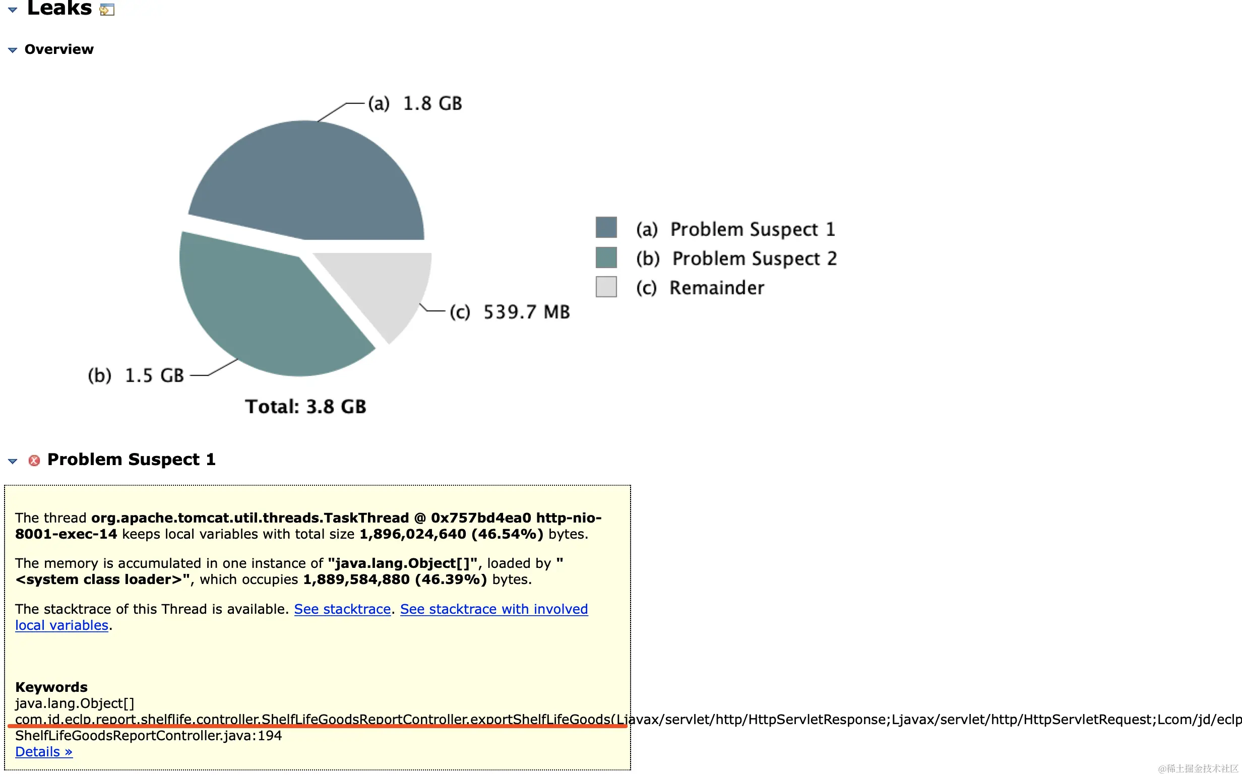随后找到对应IP机器的目录,下载了dump文件java_pid432.hprof核对时间没有问题,随即使用MAT工具开展分析,通过泄露分析结果直接就可以看出problem1与problem2都是一个同一个问题,2个线程分别占用1.8G、1.5G: