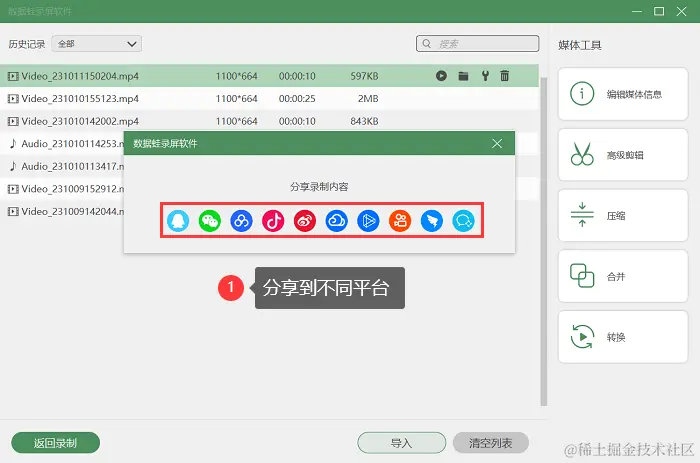 第4步:如果您想将视频分享到其它平台,进入到历史记录页面里,选中我们刚刚录制的视频文件,点击更多工具,选择进行分享。