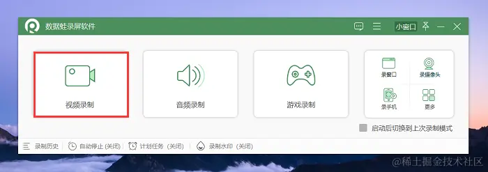 第1步:从数据蛙录屏软件的官网下载,安装完成后打开它,在软件页面可以看见多种录制模式,在右侧可以选择我们的 “视频录制” 模式。