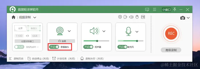第2步:在这里,您可以设置视频录制的区域,如果您想录制人像,记得提前开启摄像头,设置完成后点击最右方按钮 “开始录制” 。