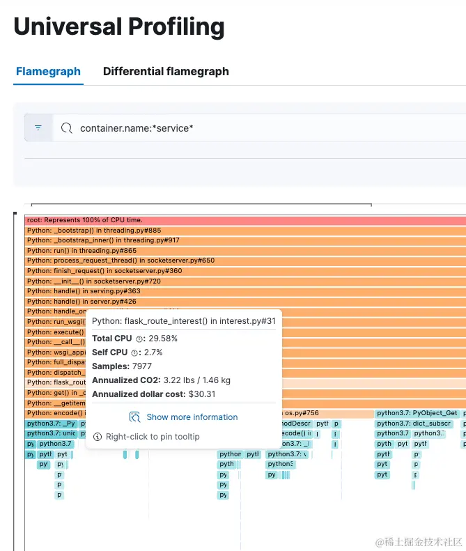 Elastic Universal Profiling 具有直观的 UI,可立即向你显示任何给定函数的影响,包括在 CPU 上执行所花费的时间以及成本和碳排放量。