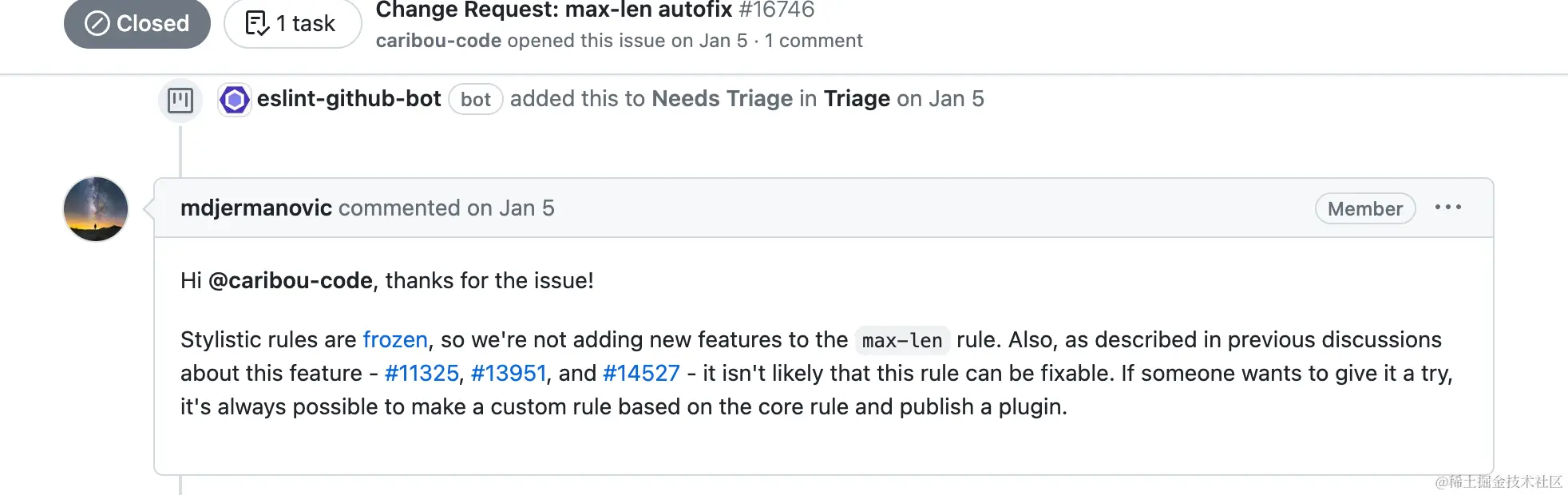 这张图是ESlint的issue,有人提过max-len不能autofix这个问题,不过官方回答:不会针对max-len提供新功能,如果有需要,可以尝试写一个插件。