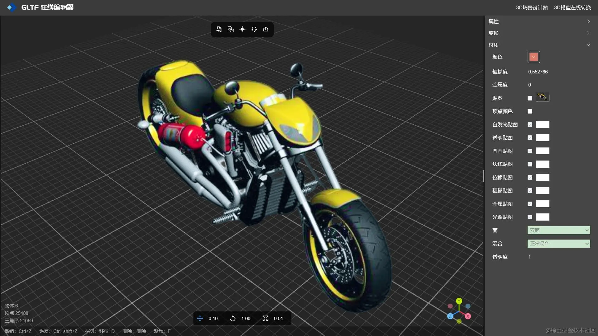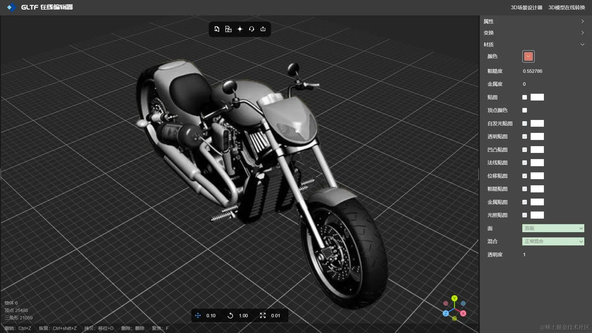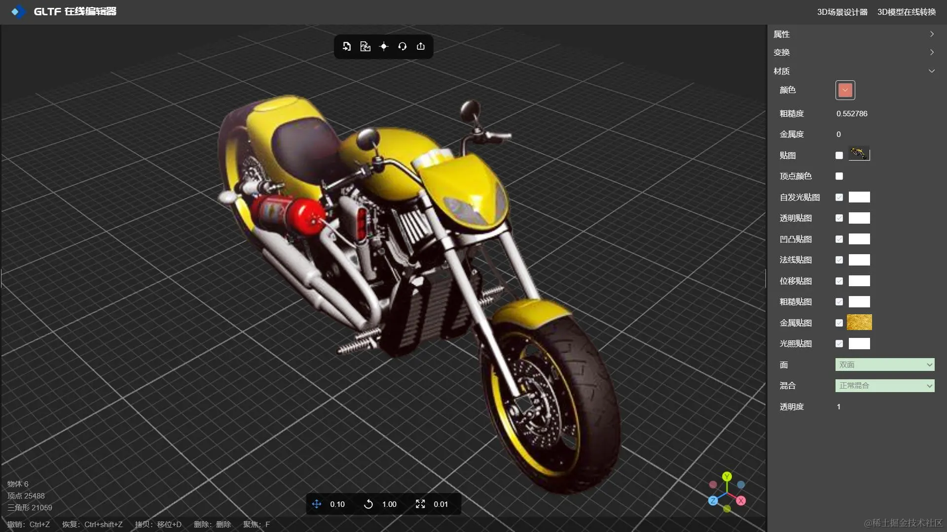 GLTF 编辑器 是一个功能强大、易于使用的在线3D模型编辑和查看工具,它支持多种格式的3D模型导入并将模型导出为GLB格式,除了可以对3D模型进行基本属性的修改之外,还支持对模型原点重置以及模型材质纹理修改。对于3D开发者和设计师来说,GLTF 编辑器 是一个非常有用的工具,可以帮助他们更方便地处理3D模型。