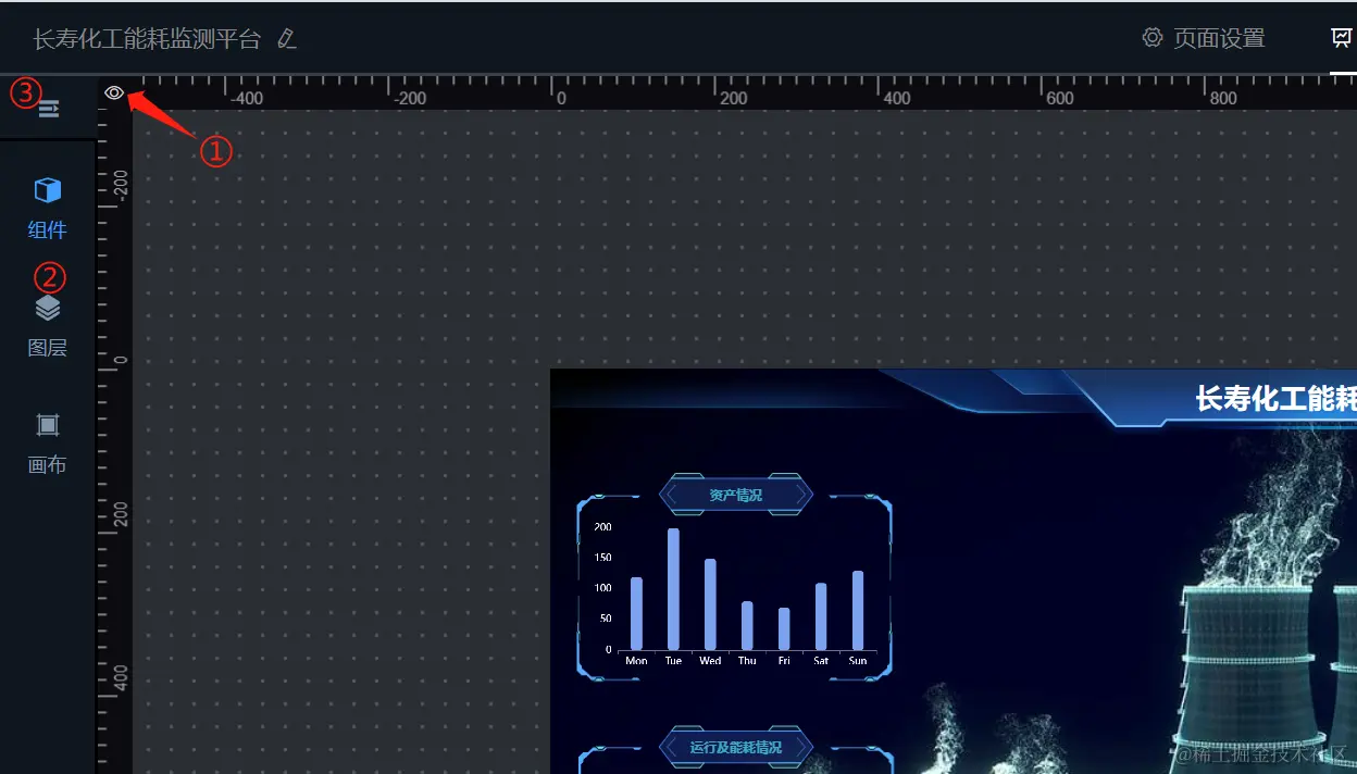 当点击上图中的②时,如果点击组件,则进入组件配置页面,如果点击的画布,则进入画布页面。