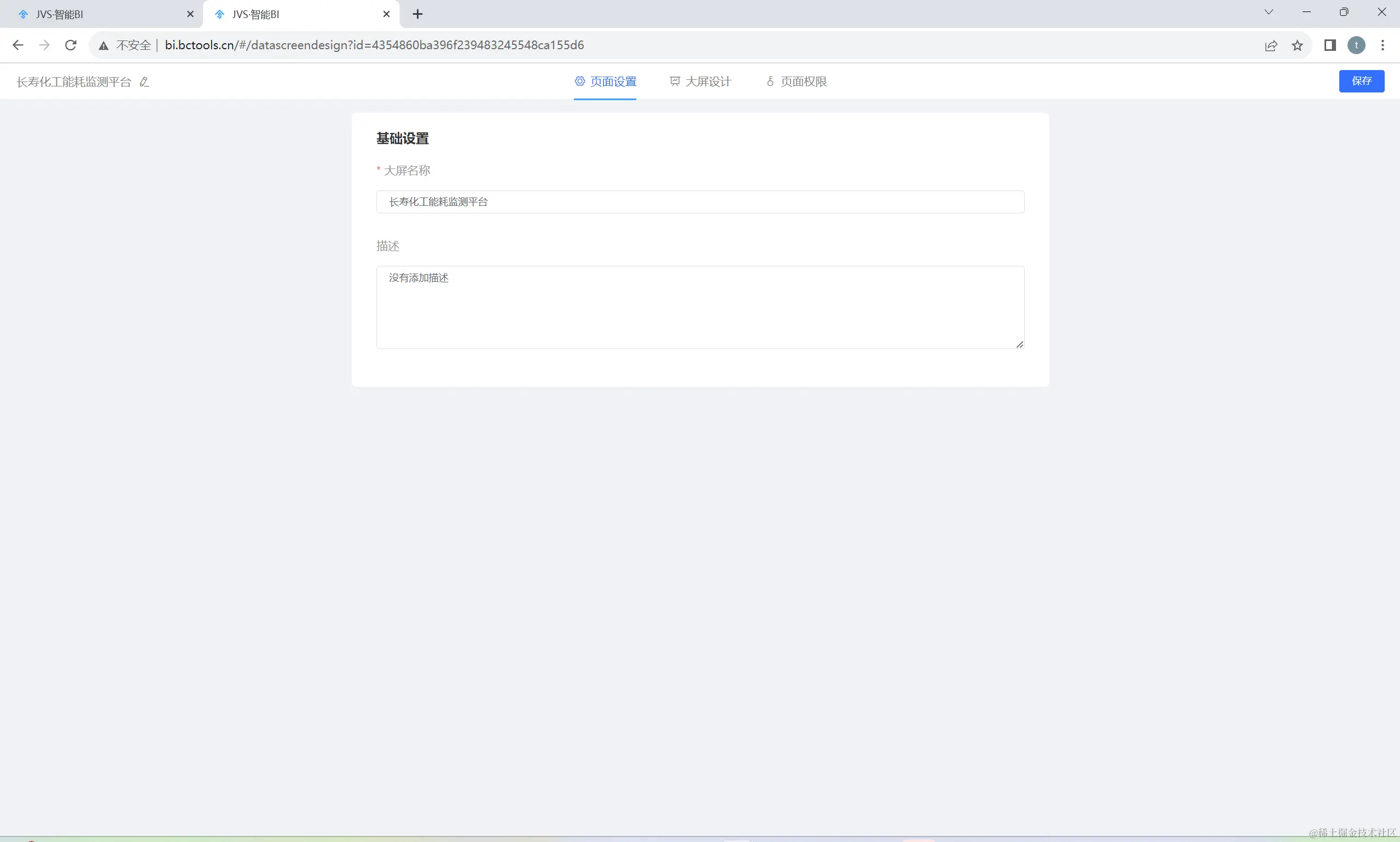 大屏设计器包括页面设置、大屏设计、页面权限三个部分,如下图所示,页面设置包括页面的基本信息和备注描述,这里的大屏名称和左上角的页面名称是实时同步的。