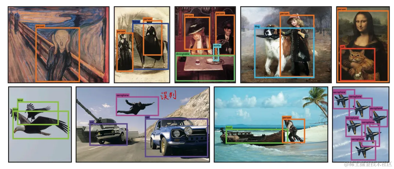 图6:定性结果。YOLO运行在样本艺术品和自然图像从互联网上。虽然它确实认为一个人是一架飞机,但它基本上是准确的。