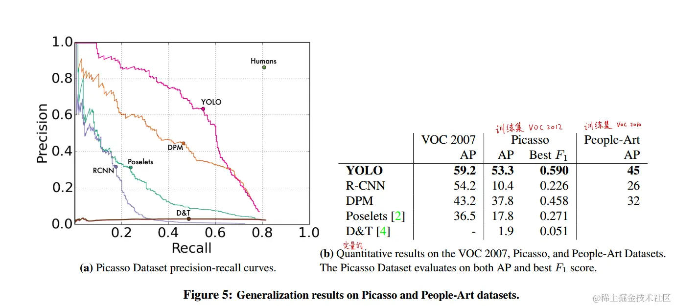 用于目标检测的学术数据集从相同的分布中提取训练和测试数据。在真实的应用程序中,很难预测所有可能的用例,并且测试数据可能与系统在2010年之前看到的数据不同。我们将YOLO与毕加索数据集[12]和人-艺术数据集[3]上的其他检测系统进行比较,这两个数据集用于测试艺术品上的人检测。 图5显示了YOLO和其他检测方法的性能对比。作为参考,我们给出了对人的VOC 2007检测AP,其中所有模型仅根据VOC 2007数据进行训练。在毕加索模型上,他们接受VOC 2012的培训,而在人物艺术上,他们接受VOC 2010的培训