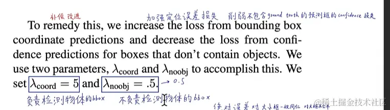 YOLO预测每个网格单元格有多个边界框。 在训练时,我们只希望一个边界框预测器负责每个对象。我们指定一个预测器“负责”预测一个对象,基于哪个预测具有最高的当前IOU与基本事实。这导致了边界框预测器之间的专门化。每个预测器在预测特定尺寸、长宽比或物体类别方面都做得更好,从而提高了整体召回率。 在培训过程中,我们优化了以下几个部分