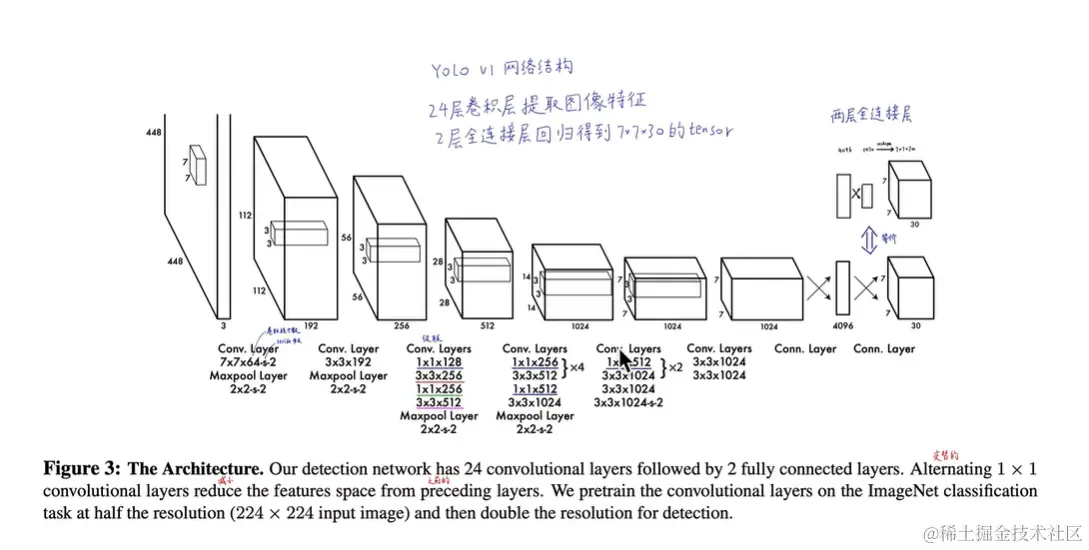 整个过程先是Imagenet 进行图像分类,去训练使用的是24*24 的输入图片的分辨率,然后是在448*448 分辨率上训练目标检测的模型。