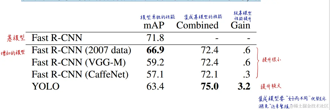 表2:VOC 2007模型组合实验。我们研究了将各种模型与Fast R-CNN的最佳版本相结合的效果。其他版本的快速R-CNN只提供了一个小的好处,而YOLO提供了显著的性能提升