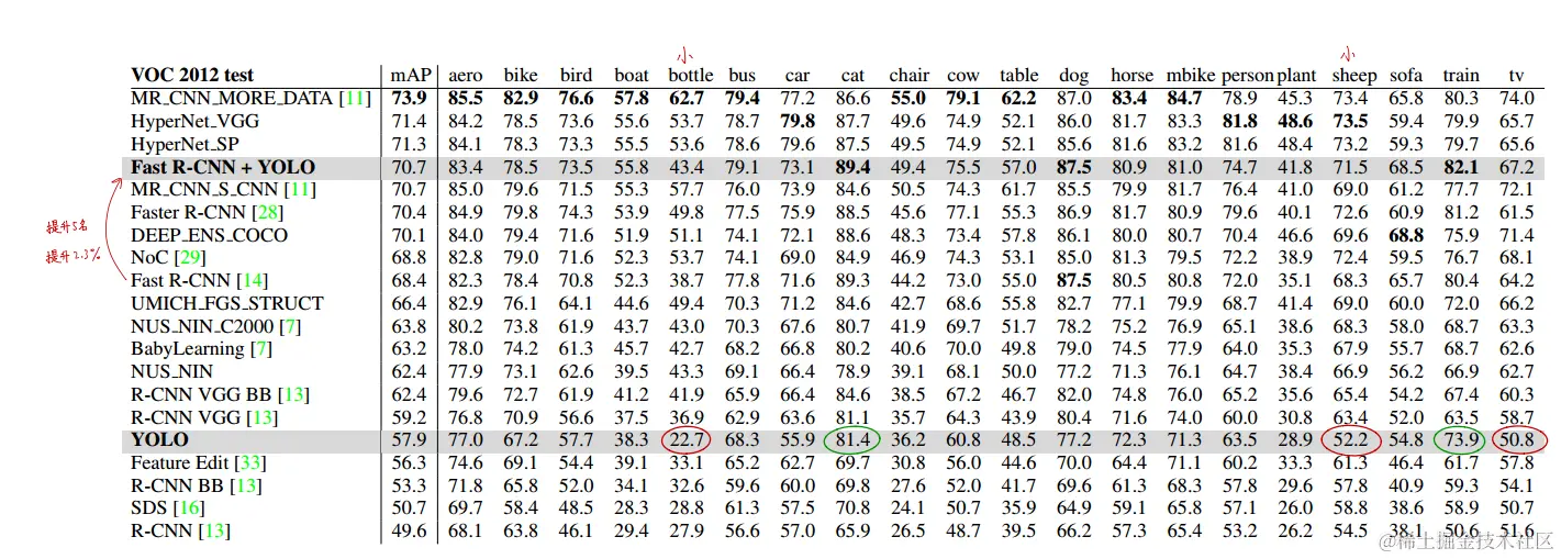 表3:2012年PASCAL VOC排行榜。YOLO与2015年11月6日完整的comp4(允许外部数据)公开排行榜的对比。显示了各种检测方法的平均平均精度和每类平均精度。YOLO是唯一的实时探测器。Fast R-CNN + YOLO是得分第四高的方法,比Fast R-CNN提高2.3%