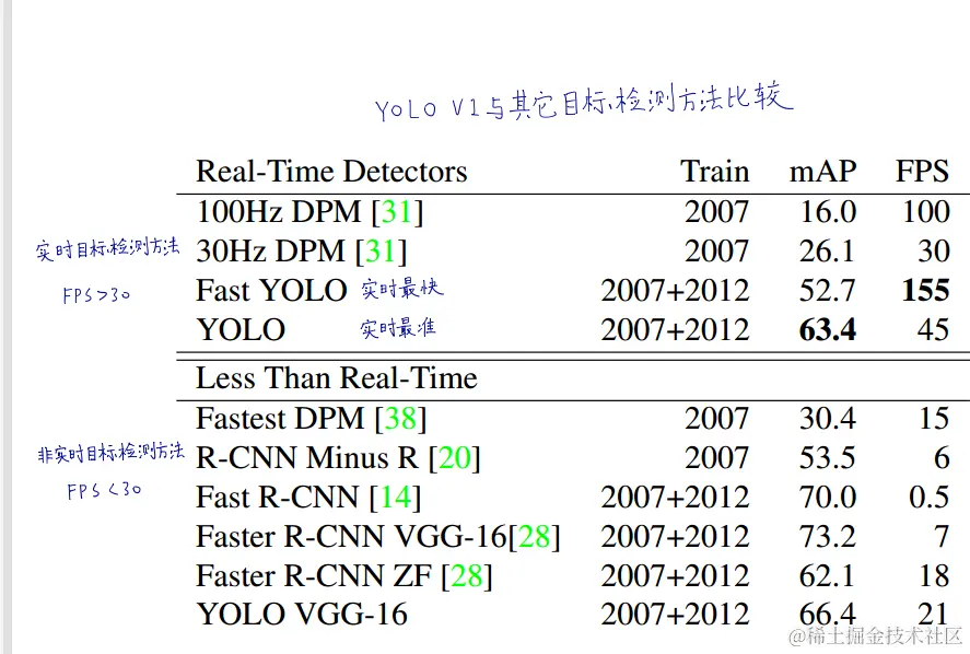 Fast YOLO是PASCAL数据集上最快的目标检测方法;据我们所知,它是现存最快的物体探测器。mAP为52.7%,比之前的实时检测精度提高了两倍多。YOLO将mAP推至63.4%,同时仍保持实时性能。 "mpa"通常指的是"mean average precision"(平均精度均值)