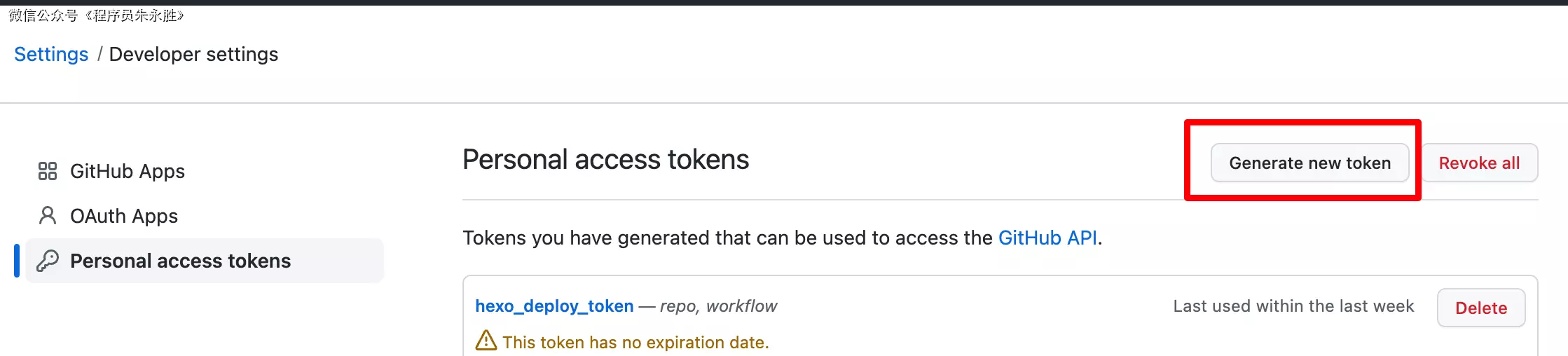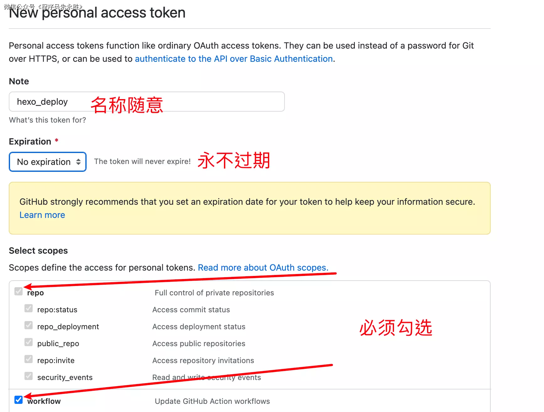 - 访问 Github->头像(右上角)->Settings->Developer Settings->Personal access tokens->generate new token,创建的 Token 名称随意,但必须勾选 repo 项 和 workflows 项。