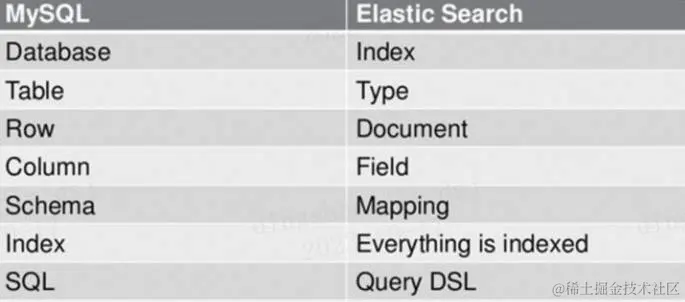 3)一个数据库表(Table)下的数据由多行(ROW)多列(column,属性)组成,等价于 1 个 Type 由多个文档(Document)和多 Field 组成。