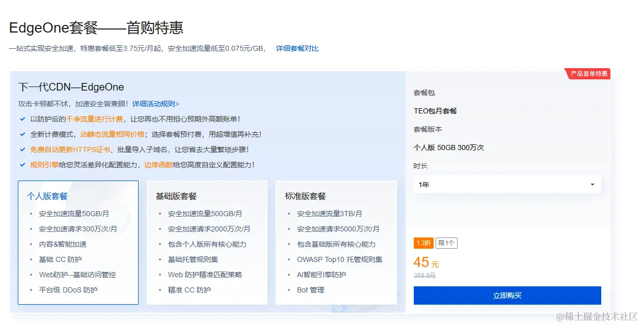 ● 一个EdgeOne套餐,可以点击这里购买。或者点击这里参加最新的活动,一年仅需45元