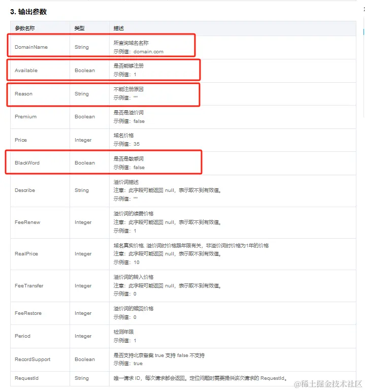 因为API的用途是查询域名是否可注册,所以只需要其中部分返回参数即可。