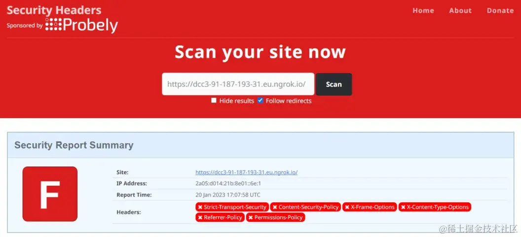 Express 中默认的 HTTP 标头不是很安全。我们使用在线 Security Headers 项目检查标头安全性: