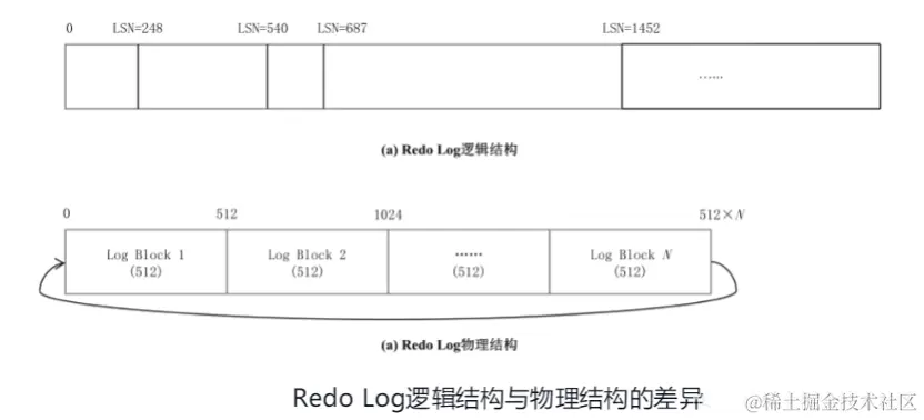 物理上面,一个固定的文件大小,每 512 个字节一个 Block,循环使用。显然,很容易通过LSN换算出所属的Block。反过来,给定Redo Log,也很容易算出第一条日志在什么位置。