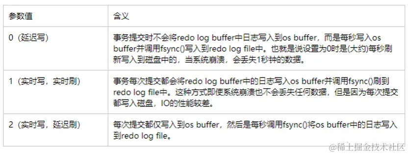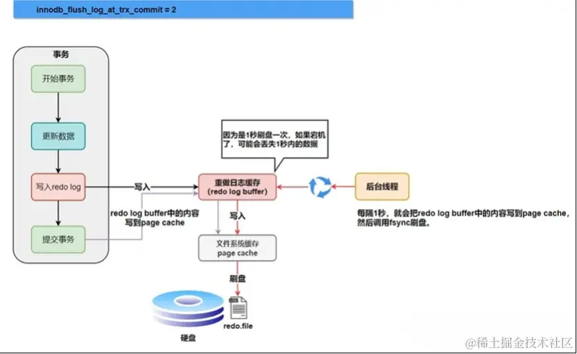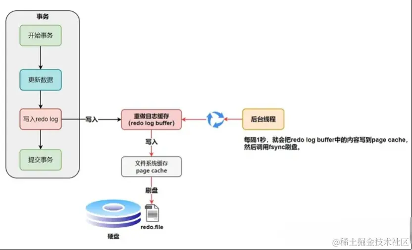 mysql支持三种将redo log buffer写入redo log file的时机,可以通过参数控制。另外,InnoDB存储引擎有一个后台线程,每隔1秒,就会把redo log buffer中的内容写到文件系统缓存(page cache),然后调用fsync刷盘。