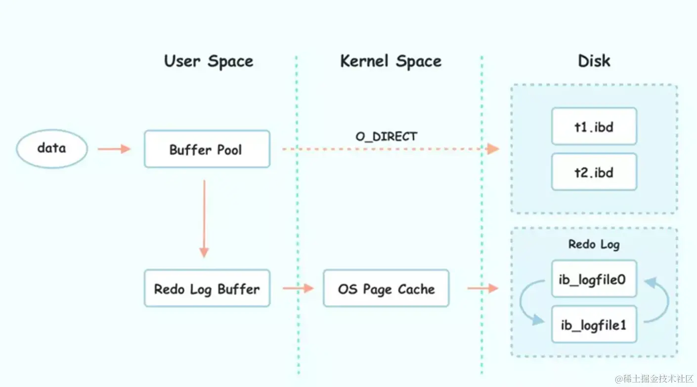 page 和log buffer先刷入os buffer,然后由计算机系统刷盘到file文件中,如下: