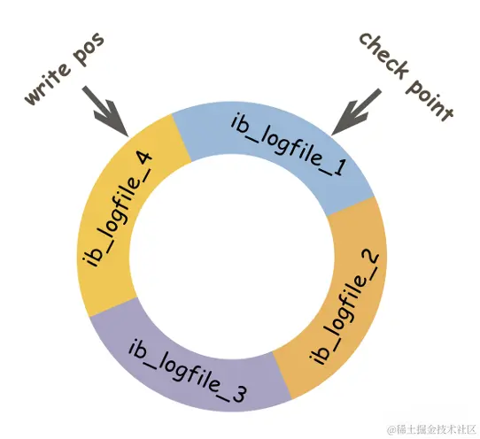 前面说过,redo log实际上记录数据页的变更,而这种变更记录是没必要全部保存,因此redo log实现上采用了大小固定,循环写入的方式,当写到结尾时,会回到开头循环写日志。如下图: