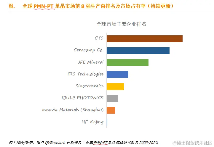 全球范围内PMN-PT单晶生产商主要包括CTS、Ceracomp Co.、JFE Mineral等。2022年,全球前三大厂商占有大约61.0%的市场份额。